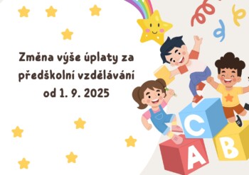 Vážení rodiče,dovolujeme si Vás informovat, že od 1. září 2025 dochází k navýšení úplaty za předškolní vzdělávání (tzv. školkovné) na částku 750 Kč měsíčně. Prosíme Vás, abyste tuto změnu vzali na vědomí a v průběhu srpna upravili své trvalé platební příkazy, případně jiný způsob úhrady. Děkujeme za pochopení a vstřícnost.Vaší důvěry si velmi vážíme a… číst dále…