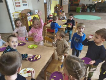 Náš projektový celek nesl název „Jablíčkový týden“. Společně jsme zkoumali vše, co s jablíčky souvisí – čichali jsme, krájeli, ochutnávali a porovnávali, zda je chutnější jablíčko červené nebo zelené. Zahráli jsme si také na malé sběrače úrody, a nechyběl ani malý pokus – „šumící jablíčka“. Pomocí jedlé sody, temperové barvy a octa jsme vytvořili barevná jablíčka, která začala šumět a bublat. Ze zbytku barvy pak vznikla sopka, která všechny děti nadchla! 🌋