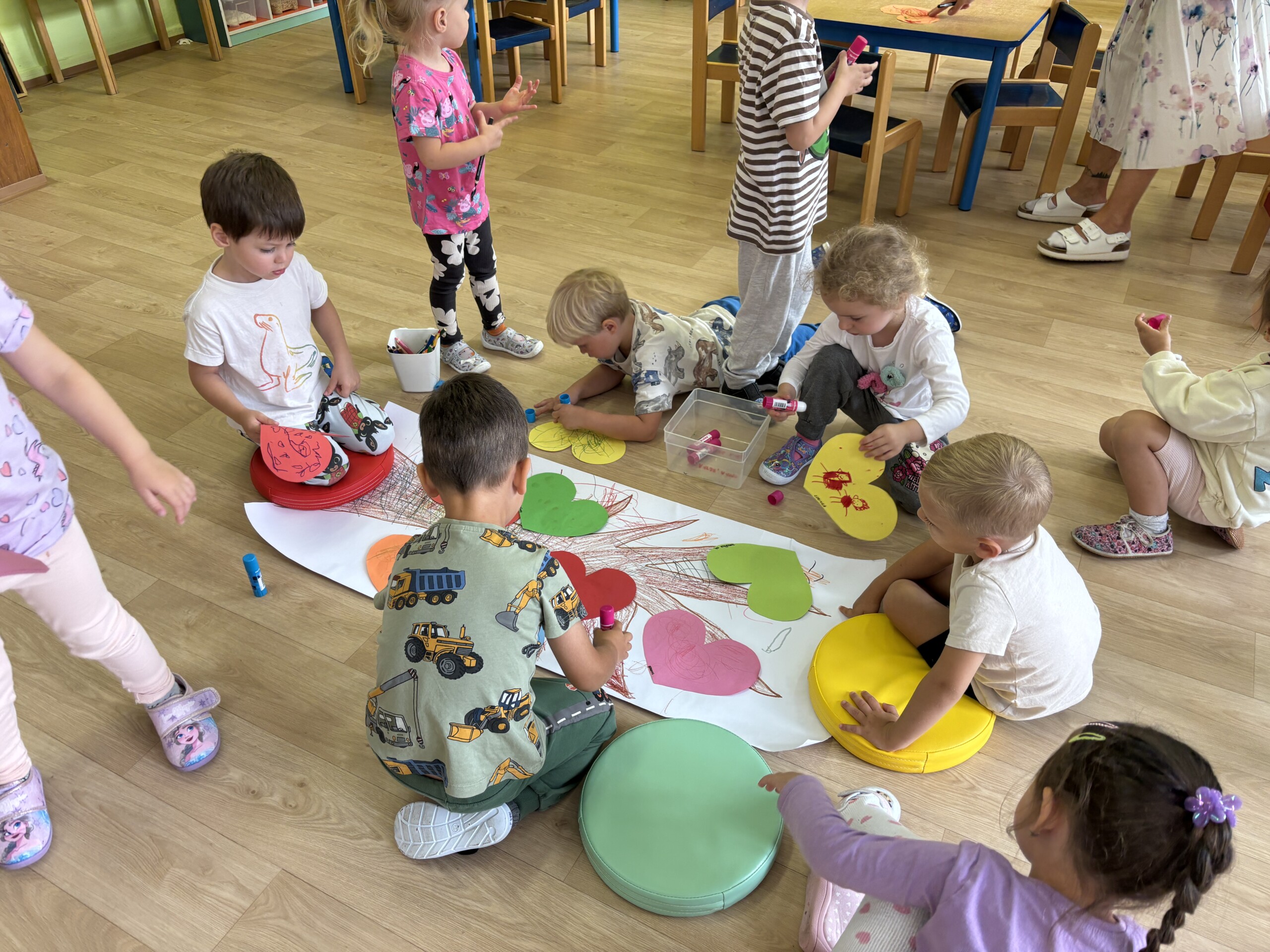 Hráli jsme si jak na zahradě, tak ve školce, poznávali třídu a postupně se učili jména kamarádů i své značky. Vyrobili jsme si Strom přátelství, který nám připomíná, že ve třídě tvoříme jednu partu. Seznamovali jsme se také s třídními pravidly – pusinkovým, ouškovým a dalšími, aby nám ve školce bylo dobře.