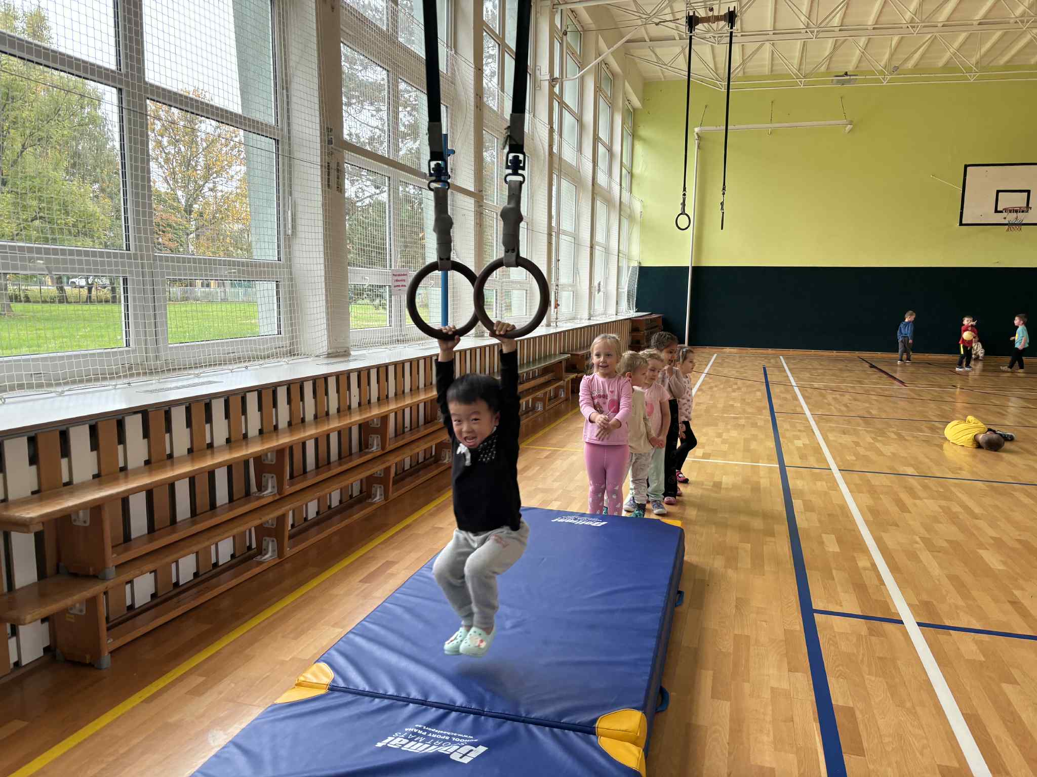 Sovičky a Berušky se vydaly na výlet do tělocvičny naší základní školy. Tam na nás čekalo spoustu zábavy a pohybu! Děti běhaly, skákaly, lezly, klouzaly se po lavičce, houpaly se na kruzích a zkoušely i trampolínu nebo švédskou bednu. Všichni si to moc užili a z tělocvičny jsme odcházeli s úsměvem a růžolícími tvářemi. Už se těšíme, až si půjdeme zase společně zasportovat! 🧡