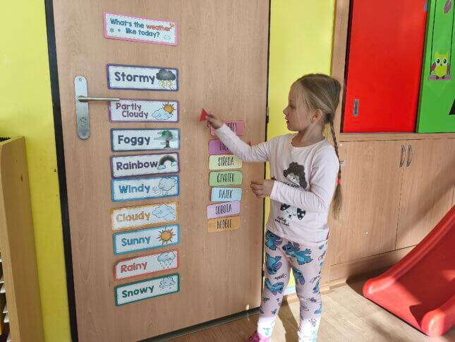 Součástí ranního setkání je také oblíbená písnička Weather Watcher, při které si děti počasí nejen pojmenují, ale také si s chutí zazpívají a rozhýbou se. Učení je tak hravé a přirozené.